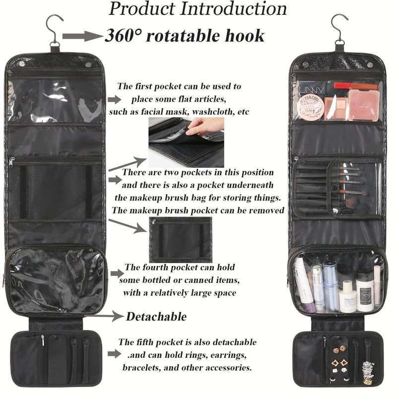 - Removable Makeup Brush and Jewelry Pouches: with removable pockets specially designed for makeup brushes and jewelry, your items stay organized, protected from damage and easily accessible during travel.
