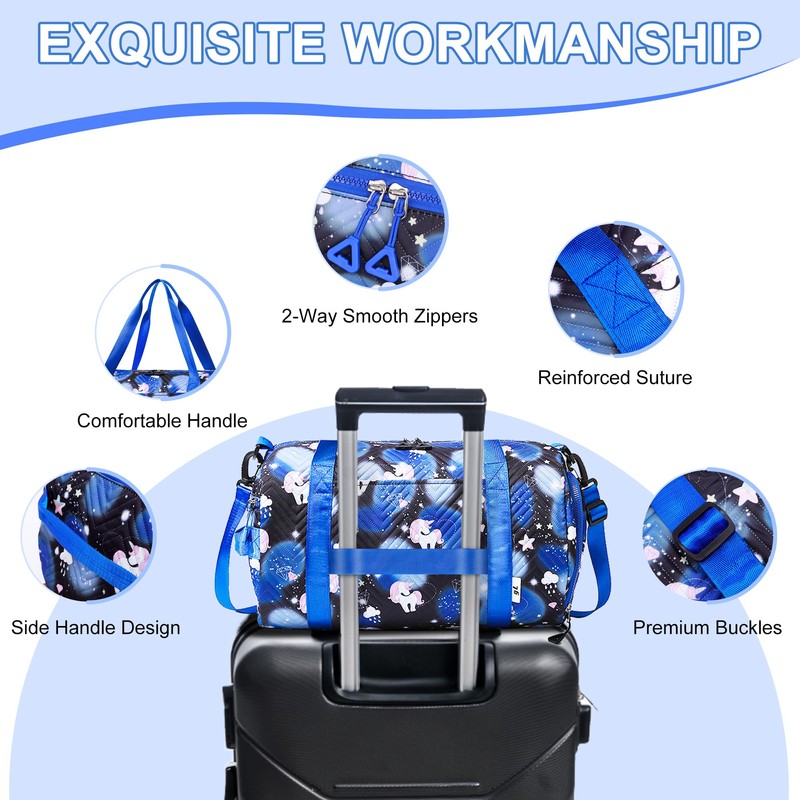 - Multi pocket design: the girls' swimming bag has a main compartment, a front pocket with zip, an inner pocket with zip, 2 inner pockets and a side pocket with zip, so you can easily organise your belongings. The side handle provides comfortable carrying options. The unique design of the travel bag allows it to be easily attached to a rolling suitcase, freeing your hands while traveling.