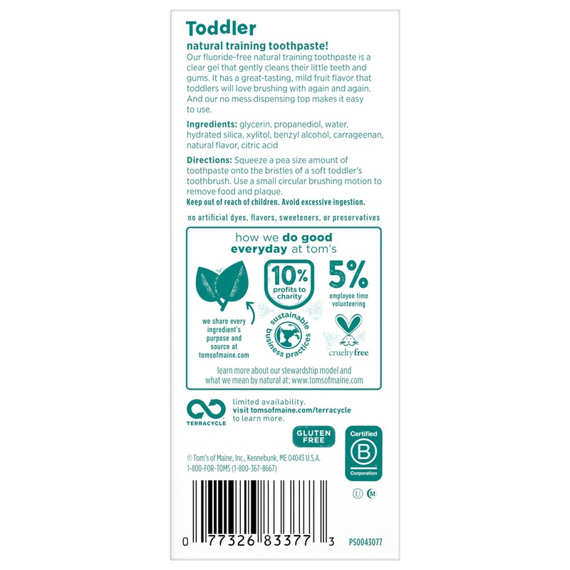 #1 Kid's Natural Toothpaste Brand, (Based in part on data reported by Nielsen through its Connect Service for the Toothpaste Category for the 52 week period ending 8/27/22, for the AOC market. Copyright © 2022 Nielsen.) Take gentle care of your favorite little mouth. Tom's of Maine Fluoride-Free Toddler Training Toothpaste is specially formulated for ages 3 to 24 months. The clear gel baby toothpaste gently cleans teeth and gums — and is safe if swallowed. That's a relief! Plus, your toddler will love brushing with the great-tasting Mild Fruit flavor again and again. And when you're done using your toothpaste, you can recycle the tube! Check to be sure that your tube has the blue recycling flag on it, squeeze out as much of the toothpaste from the tube as you can, replace the cap, and place the tube in your recycling bin. At Tom's of Maine, we want to empower families to live more naturally. With more than 50 years experience combining scientific know-how, naturally derived ingredients and a bit of ingenuity, we make products that are good for you and the planet. As a Certified B Corp, we hold ourselves to the highest social and environmental standards. Plus, we're committed to supporting local communities for meaningful change, donating 10% of our profits to charities supporting health, education and the environment. We call this "doing good, for real," and it impacts everything we do.