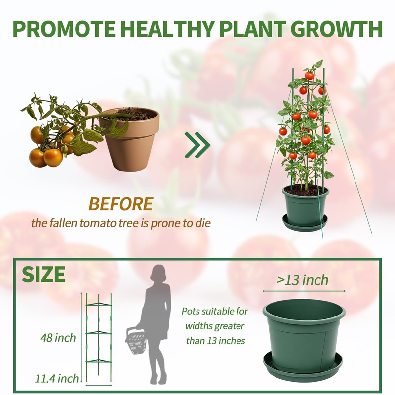Transform your garden with these versatile 48-inch tomato support cages, perfect for both in-ground gardens and container growing. This set of 4 sturdy trellis cages provides reliable support for your climbing vegetables, especially tomato plants as they grow and develop fruit. The multi-functional design works wonderfully for various climbing plants, helping to keep your garden organized and productive. These cages help prevent your plants from sprawling on the ground, which can lead to better air circulation and easier harvesting. The 48-inch height is ideal for most determinate and indeterminate tomato varieties, while also being suitable for other climbing vegetables. Each cage in this 4-pack is designed for easy installation and seasonal storage. Whether you're an experienced gardener or just starting out, these support cages are an essential tool for maintaining a tidy and productive vegetable garden.
