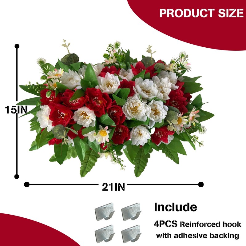 Tombstone Flowers - Outdoor Grave Decorations, Cemetery Flowers for a Grave to Be Placed on a Tombstone, The Cemetery Flowers for Grave Saddle Are Composed of Artificial Red and White Peony Bouquets