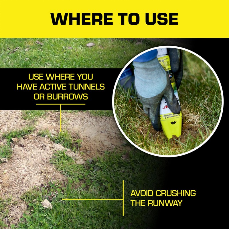 • Follow application directions on product label to properly control your mole (not for mole use in CA or IN; not for use against star-nosed mole in NC) or pocket gopher (not for use against gophers in NC) problem