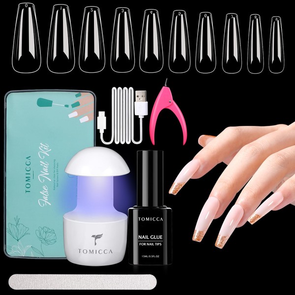 TOMICCA Gel Nail Kit Nail Tips and Gel Nail Glue, 4 In 1 Nail Glue Gel 500pcs Long Coffin Soft Gel Nail Tips, Nail Extension Kit Fake Nails Acrylic Nails with UV LED Lamp, Nail Clipper for DIY Gel Nail Art