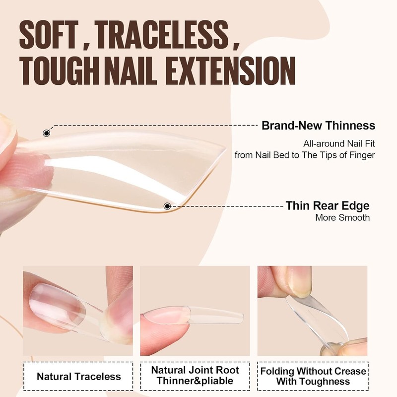 - Long Coffin Nail Tips: Full cover soft gel nail tips are made of high-quality ABS material, breathable, lightweight, durable, easy to use and perfectly comfortable for every finger, make your nails look natural and nice. 500pcs artificial nails tips, including 10 different sizes, each size has 50 acrylic nails, numbered from 0-9 respectively. Easy to choose the suitable size for each finger.