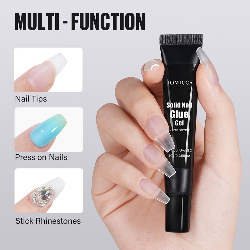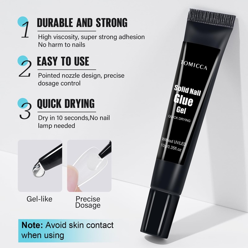- QUICK-DRYING AND LONG LASTING: Our TOMICCA nail glue fast-drying formula sets in seconds, allowing for a secure and efficient attachment of nail enhancements and embellishments. This acrylic nail glue is strong, durable and long lasting for press on nails, false nails, soft gel nail tips. It Lasts more than 14 days with a nice nail prepping.