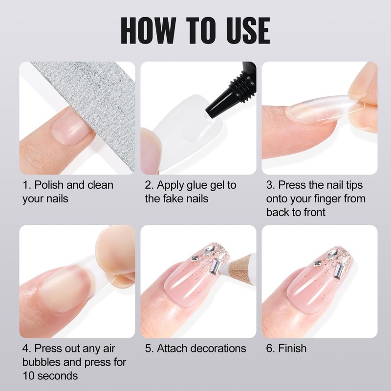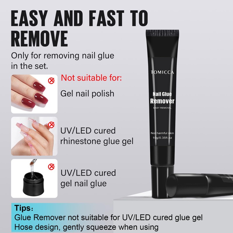 - Safe to Use: TOMICCA nail tips glue and remover are made of safe ingredients making it low odor and no harm to your nails. Do not destroy or peel off the nails directly, which may do harm to your nails.