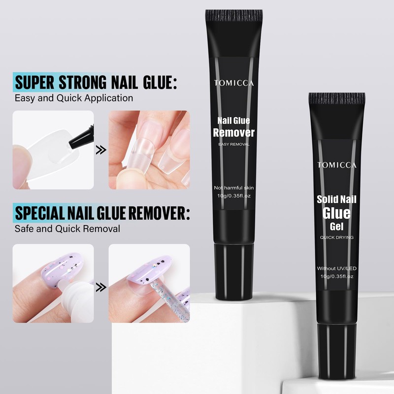 TOMICCA Solid Nail Glue Gel & Nail Glue Remover Kit, Air Dry Extra Strong Nail Glue for Acrylic Nails, Nail Glue Remover for Press on Nails False Nail, Easy to Use and Remove