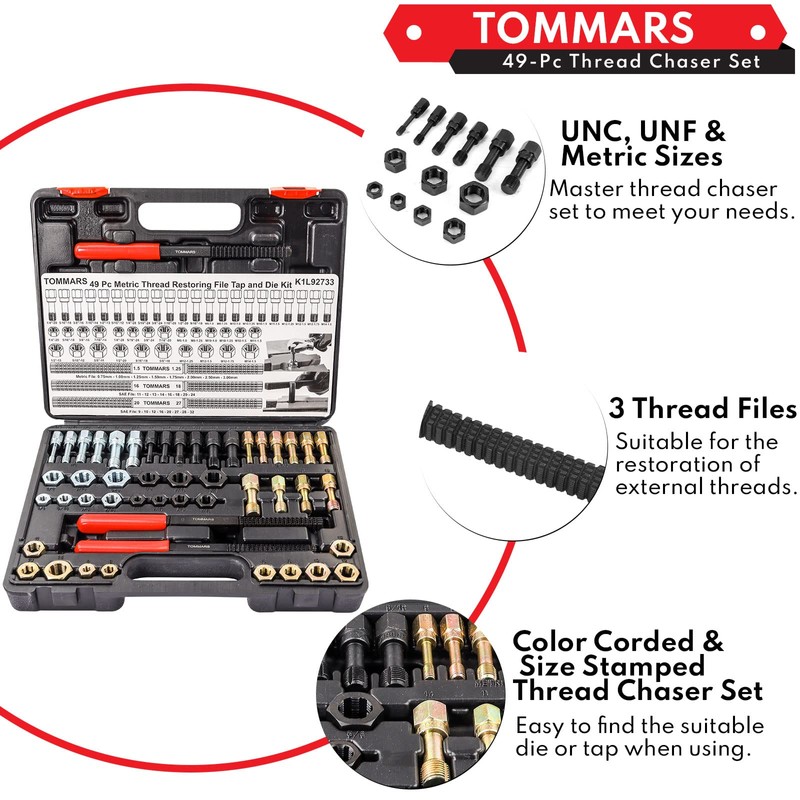 TOMMARS 49-Piece Thread Chaser Set Repair Kit, UNC UNF & Metric with Taps, Dies, and Thread Files for Rethreading and Restoration