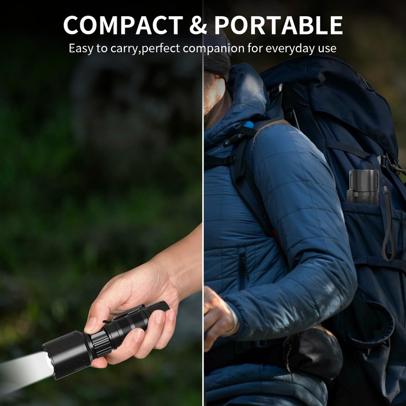 - 🔦TYPE-C Fast Charging & Power Display: Built-in large-capacity ba-tt-ery and a fast-charging Type-C interface(included cable), the rechargeable flashlight can be fully charged efficiently and work for 8-12 hours in different lighting modes. There are 4 blue power indicator on the tail of the flashlight (100% -75% -50% -25%), you can know the power status at any time. The rechargeable flashlight can also be used as an Emergency Power Bank.