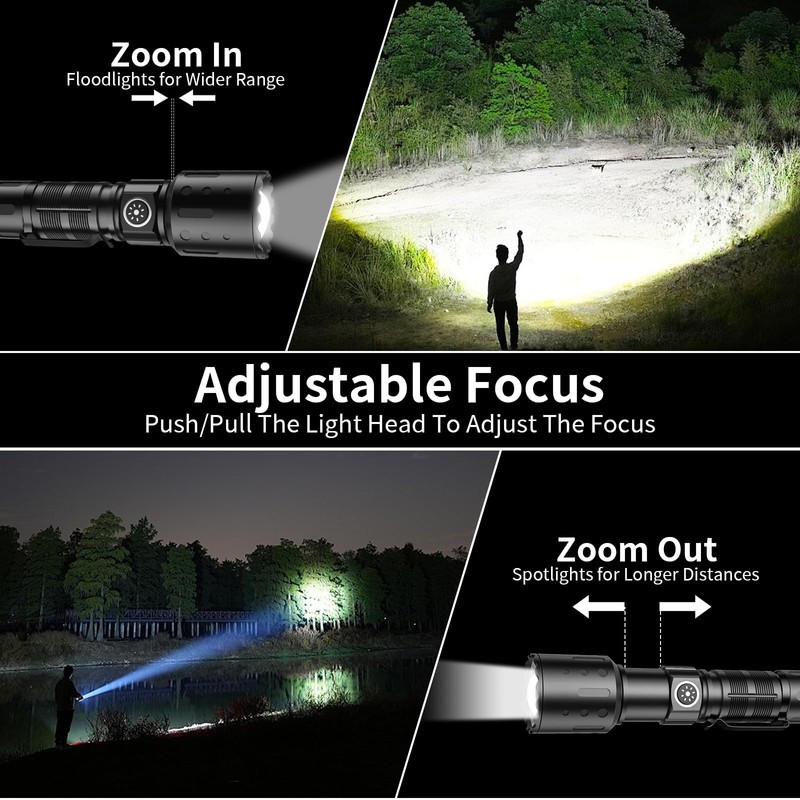 - 🔦Adjustable Focus & 6 Lighting Mode&Memory Function : Adjusting the focal length of the flashlight can change the size of the beam(Push/pull the light head), so that you can switch the long-distance observation function and wide-range lighting function. The flash light is set up with 6 lighting modes -High/Medium/Low/Strobe/SOS/TURBO Mode. The flashlight can be turned off directly by long press for 3s or staying for 5s in any mode. After 5s, turn off the flashlight and turn it on again to enter the mode before shutting down(Memory Function).