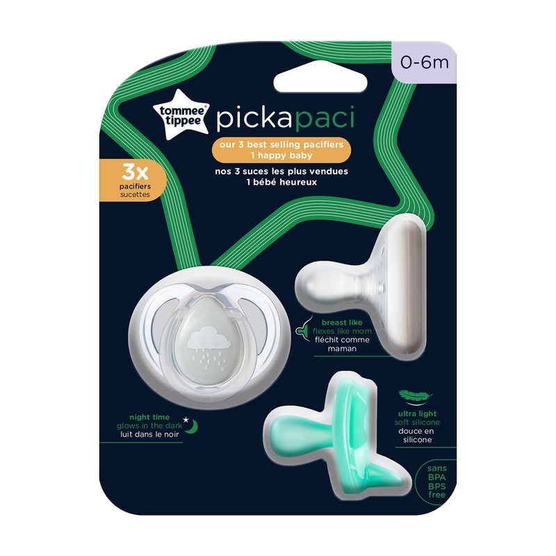Tommee Tippee Pickapaci Mixed Pacifier 3 Pack, Breast-like, Ultralight and Night-Time Glow in the Dark, 0-6m, 3 Count