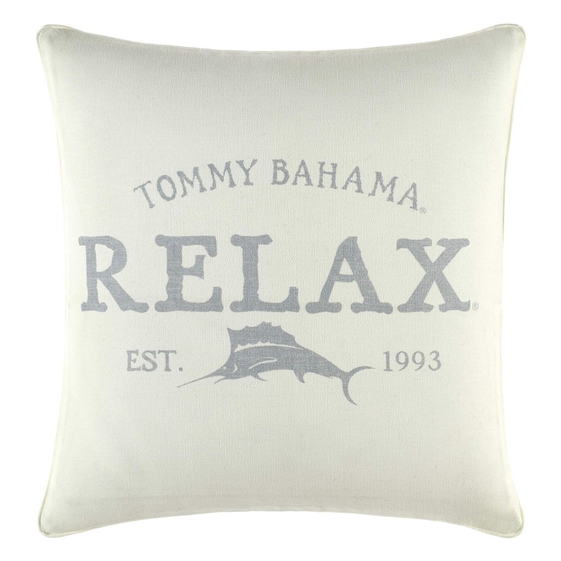 Add a tropical touch to your bedroom with the Relax Throw Pillow from Relax by Tommy Bahama. This coastal accent pillow features the phrase "Relax" in grey in the center of the pillow as well as Tommy's signature marlin logo on the crisp white ground. Made of 100% cotton, this super soft pillow is the perfect addition to your bedroom or living room décor. For a more elevated look, pair this decorative pillow with any of the Relax by Tommy Bahama comforter or duvet cover sets. Throw pillow is spot clean only and features a zipper closure and removable polyester insert. Dimensions: 18" L x 18"W.