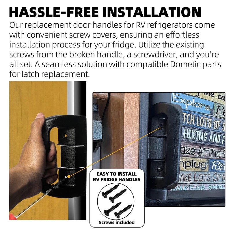 - HASSLE-FREE INSTALLATION - Our replacement door handles for RV refrigerators come with convenient screw covers, ensuring an effortless installation process for your fridge. Utilize the existing screws from the broken handle, a screwdriver, and you're all set. A seamless solution with compatible Dometic parts for latch replacement.