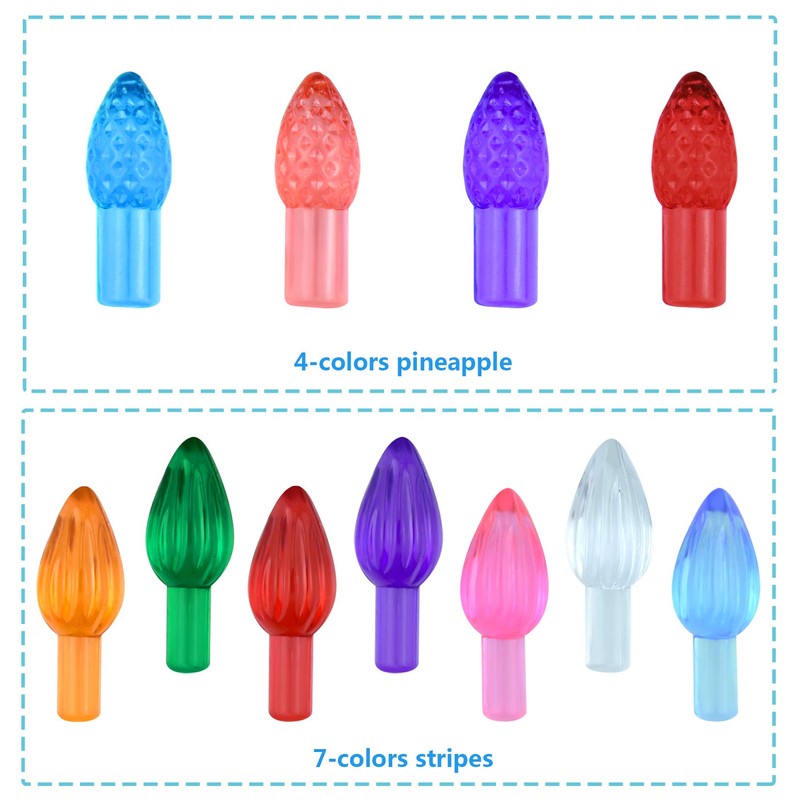 Product Specification: Quantity:300 pieces Color:150pcs 7 color Striped style and 150 4 color Pineapple style,please refer to the picture. Material:Plastic Convenient to Use: Just insert these ceramic Christmas tree lights into the ceramic tree, do not spend your much time and energy, easy operation for your and your whole family, do the interesting decoration together, have a nice Christmas time with family. Christmas Gift Choice: Our ceramic tree plastic light up bulbs have rich colors, expect decorating the ceramic Christmas tree, they are ideal addition to your Christmas presents, put different colors ceramic Christmas tree replacement lights in a glass bottle, will be colorful, then give to your friends or lovers, they will leave a deep impression on this mellow gift. Note: Small parts may be included, please keep away from kids and pets to avoid swallowing. Due to different displays, the colors may exist a little difference.