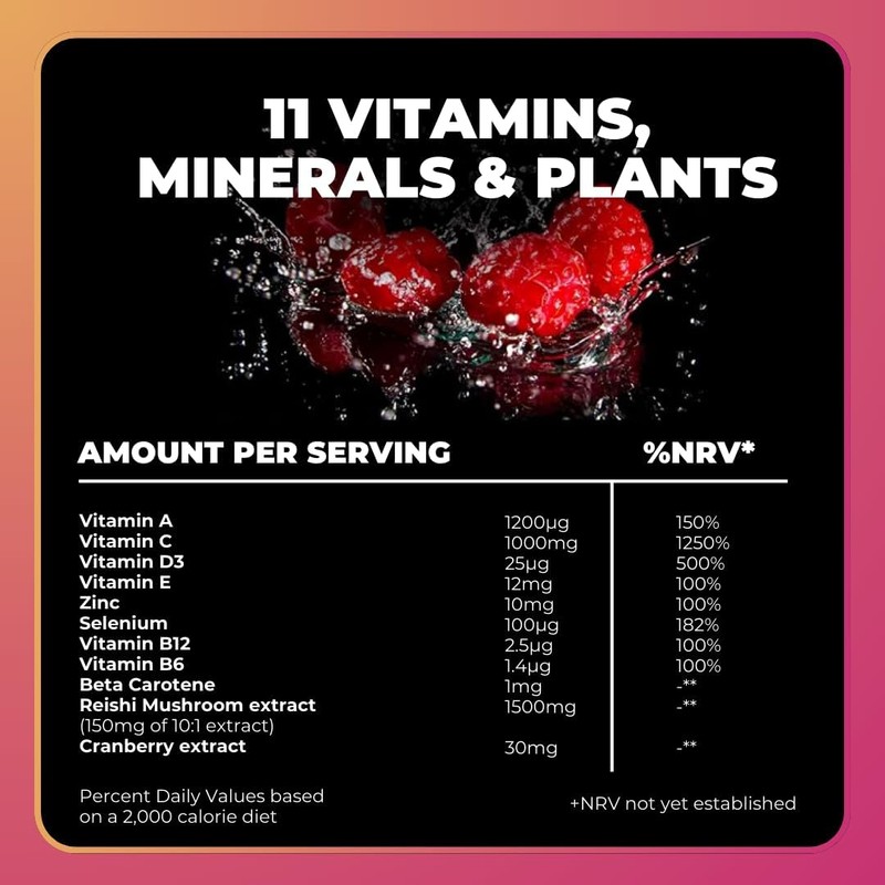 - REFRESHING RASPBERRY & LEMON VITAMIN DRINK - Vegetarian & Vegan. Packed with powerful nutrients for immune support, including plant-based Vitamin D3. Made with only the finest ingredients, free from artificial flavours or colourings