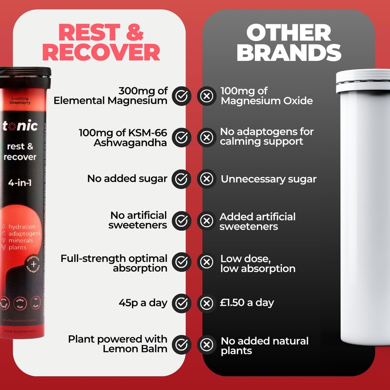 Tonic Health Rest and Recovery Effervescent Tablets - 300mg Elemental Magnesium, Ashwagandha, Lemon Balm - No Sugar, Magnesium Glycinate - Relax and Recharge, Strawberry 160 Count