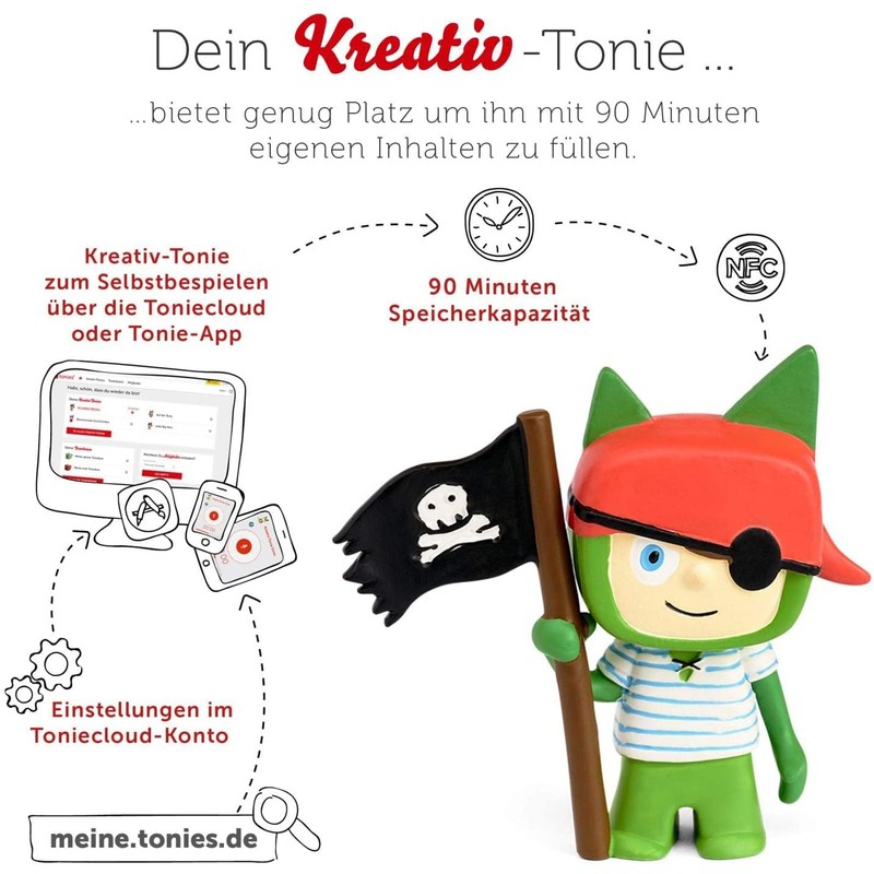 - All content of the Kreativ-Tonies can be managed with a free Toniecloud customer account. The Creative Tonie offers 90 minutes of playing time for your own listening adventures or music