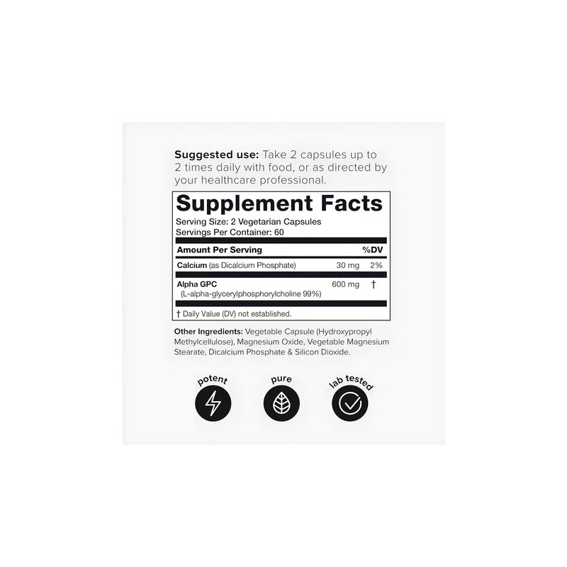 Descripción Limpia: La forma altamente purificada de Alpha GPC: las cápsulas Toniiq Alpha GPC contienen 600 mg de Alpha GPC de la más alta calidad en cada porción. Nuestro Alpha-GPC contiene un nivel de pureza sin precedentes del 99%+.