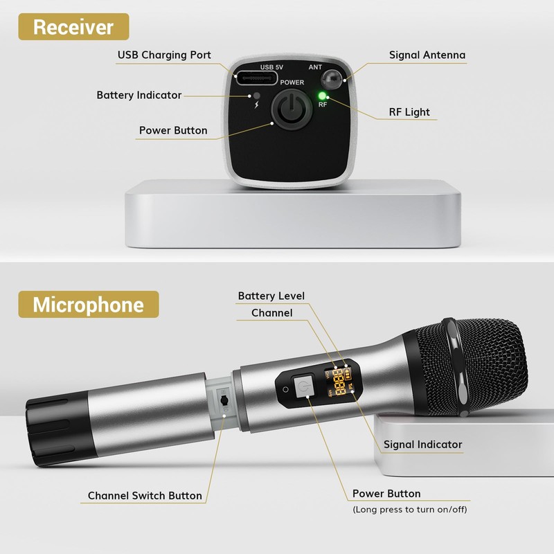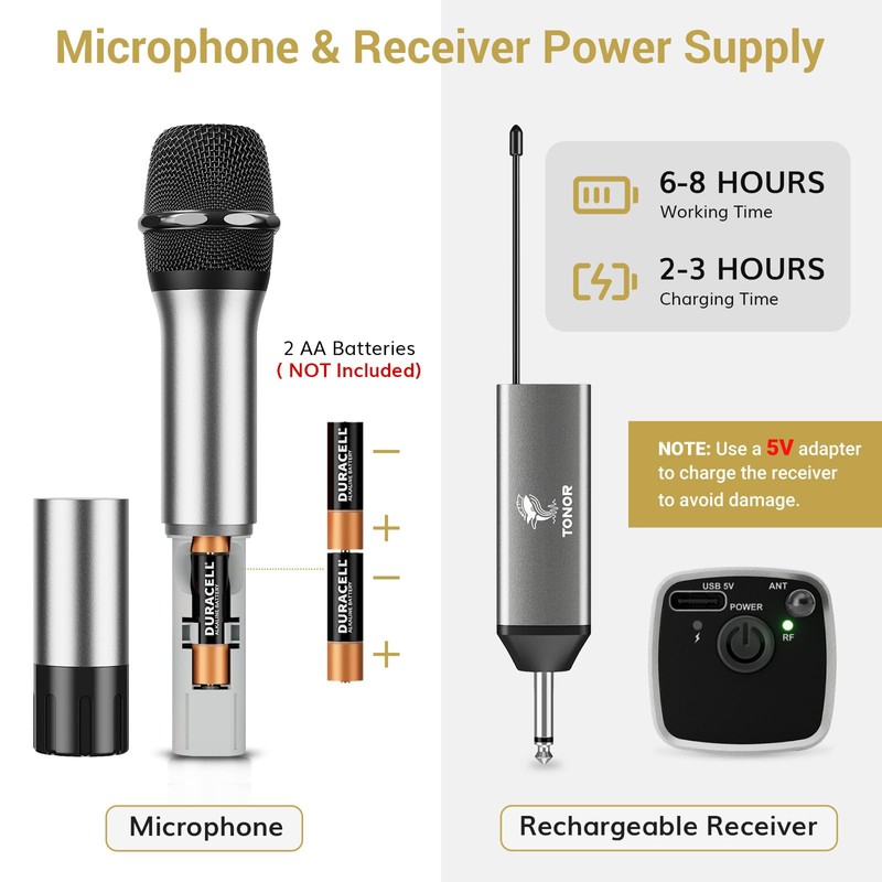 - What You Get1 x handheld microphone, 1 x receiver with a 6.35mm plug, 1 x anti-slip ring, 1 x mic cover, 1 x USB charging cable and 1 x manual. Note: 2*AA batteries are required (not included).