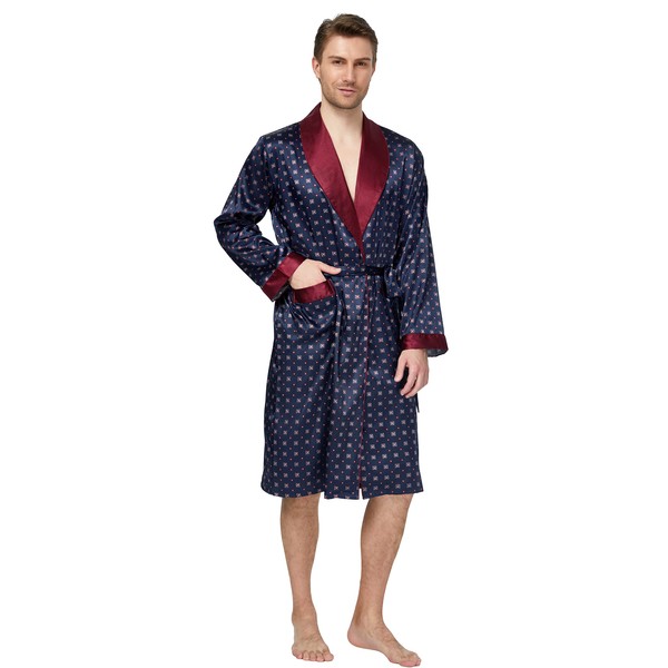 Tony & Candice Men's Satin Robe Lightweight Long Sleeve Silk Kimono Bathrobe with Shorts Set Sleepwear, Blue / Burgundy, X-Large