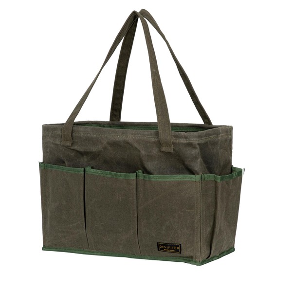 Tool Bag with Metal Frame, Waxed Canvas Wide Open Top Tool Tote Bag with 9 External Pockets, 15.5 x 7.5 x 10.5 Inches (ArmyGreen)