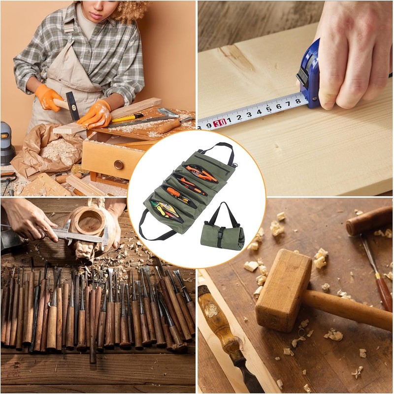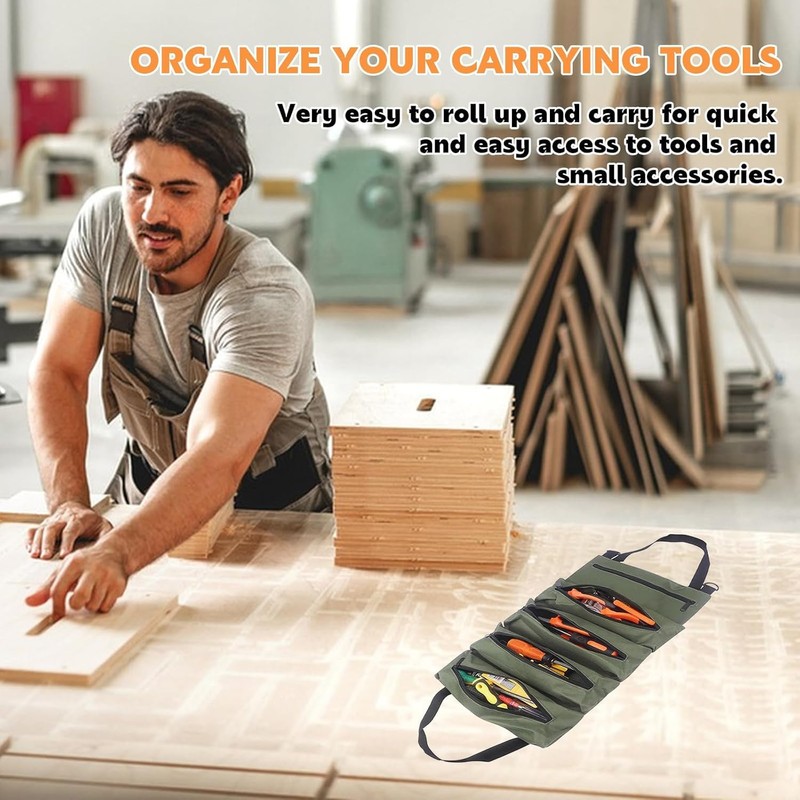 This Tool Roll Bag is crafted from durable canvas, ensuring long-lasting use in tough work environments. With 5 zip pockets, it offers organized storage for various tools, keeping wrenches, screwdrivers, and equipment secure and accessible. Designed for plumbers, electricians, and craftsmen, its multi-purpose design suits diverse tasks. The army green color not only looks heavy-duty but also resists stains. Its roll-up design allows easy portability, making it a convenient choice for professionals on the go.