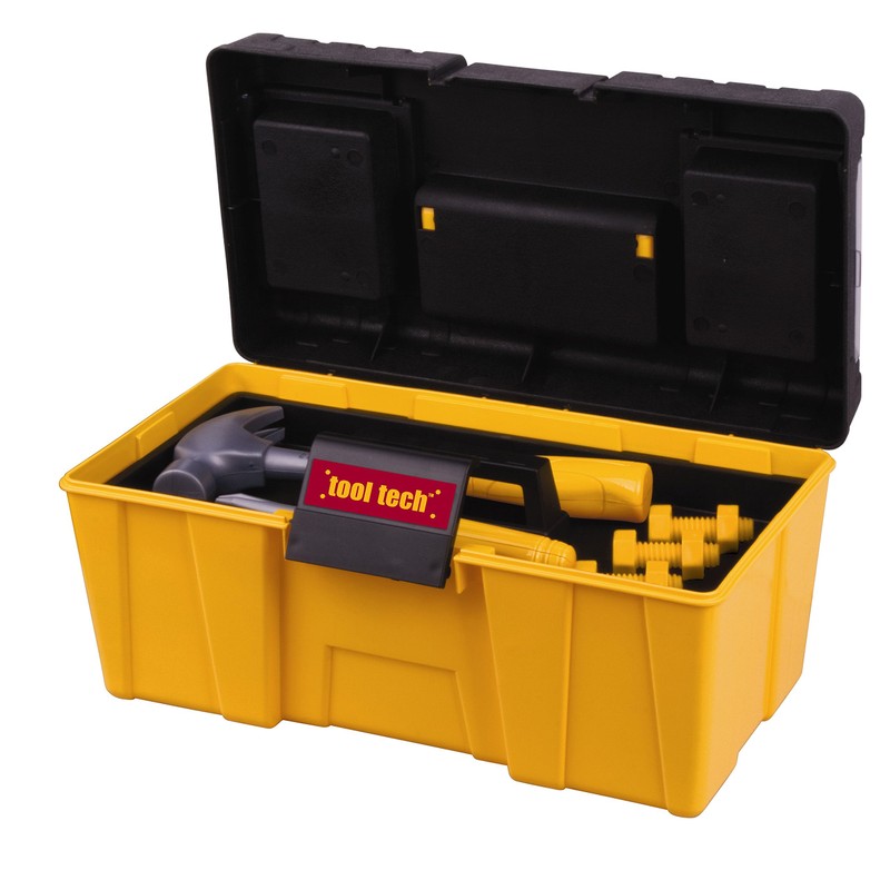 This super-fun tool box will make any little handyman feel like a grown up! Deluxe set is made of rugged hi-impact plastic; includes a hammer, saw, tape measure, goggles, clear storage trays on top, pliers, wrenches and more!