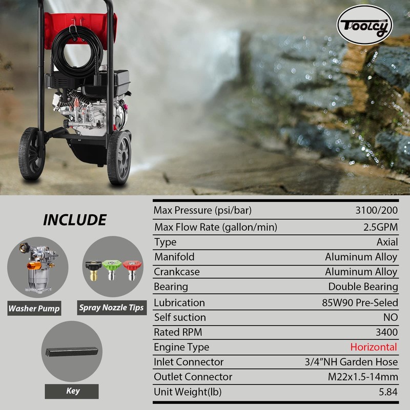 - 【EFFICIENT WORK】Come with 3 special test matched nozzle tips (0°/25°/soap) for best cleaning performance.If you need a higher pressure cleaning pump, it is equipped with a larger 3100 PSI / 2.5 GPM flow rate to complete the cleaning job more efficiently, allowing you to easily start cleaning in more scenarios (eg. garden, house, car, road etc). ⚠ Will not fit 7/8 inch shaft gas engine.