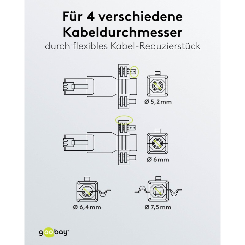 - New version with cable reducer so suitable for 3 different cables diameter: up to 5.2 / 6.4 / 7.5 mm for flexible and rigid inner conductors (AWG 22 to 26)