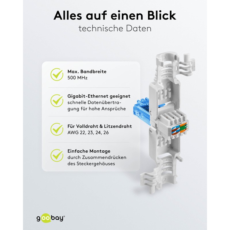 - Connector 1: type RJ45 plug (8P8C); connector 2: type terminal block for LSA mounting (tool-free) connection; contact material gold-plated 3μ