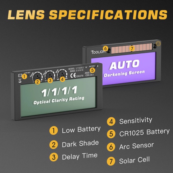 - Auto-darkening welding lens shade depth, sensitivity and delay are adjustable, the lens is equipped with two sensors that can automatically adjust the brightness according to the environment to meet different work requirements