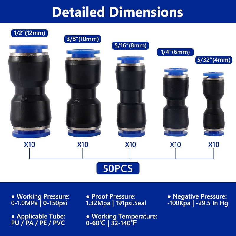 (10pcs 5/32" fittings, 10pcs 1/4" fittings, 10pcs 5/16" fittings, 10pcs 3/8" fittings, 10pcs 1/2" fittings)