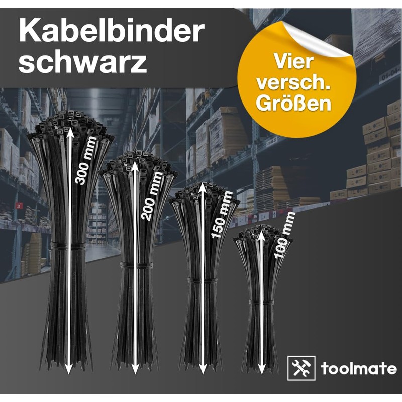- Various lengths. The set offers a choice of different lengths, allowing for flexible use. They can be used for small tasks such as bundling cables or larger projects such as securing garden accessories. DIV. Sizes: 200 x 100 mm, 200 x 150 mm, 50 x 200 mm, 50 x 300 mm