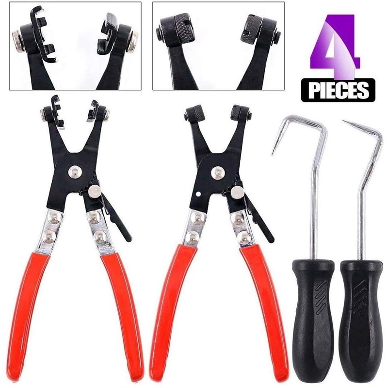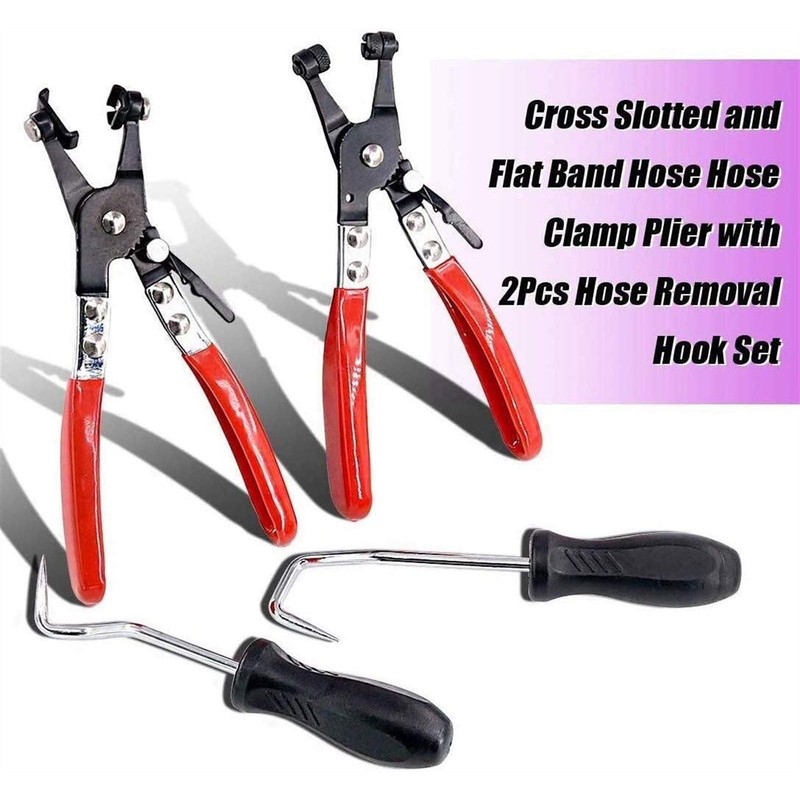 - WHAT YOU GET ----- In this kit, You will get 4Pcs Hose Clamp Plier Set, Including 2Pcs Cross Slotted and Flat Band Hose Hose Clamp Plier with 2Pcs Hose Removal Hook Set. Compatible with most ring and flat band type clamps. Clamps are held open with a ratchet locking mechanism Jaws swivel to access hose clamps in any position.