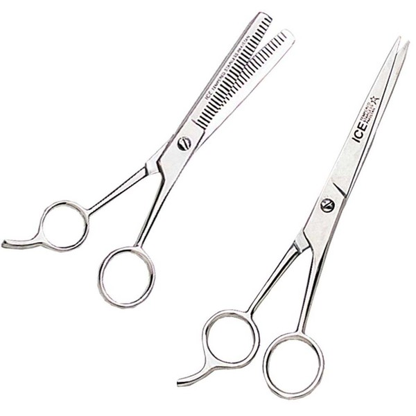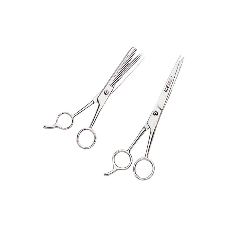 ToolUSA Premium Barber Scissor Duo (KIT-SC68000). Designed for both professional barbers and home styling enthusiasts, this scissor duo stands as a testament to exceptional craftsmanship and functionality. Precision is key in hairdressing, and with these scissors, precision is what you get. The set showcases two specialized scissors. The 7" (≈17.8cm) regular barber scissor, fashioned from the highest quality stainless steel, guarantees a smooth and even cut every time. Its sharp blades glide effortlessly through hair, ensuring a clean finish. Complementing it is the 6.5" (≈16.5cm) double-edged thinning scissor, perfect for creating layers and reducing volume with its double-sided thinning blades. What truly sets these scissors apart is the inclusion of a special finger lever on each. This design grants the user additional control, vital for detailed styling and precision cuts. The robust stainless steel construction not only ensures durability but also offers a lustrous appeal, making the scissors a worthy addition to any hairstyling toolkit. Be it for professional salon use or passionate DIY hair ventures, the ToolUSA Premium Barber Scissor Duo brings quality and performance to the fore.