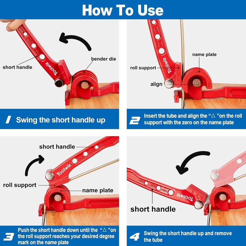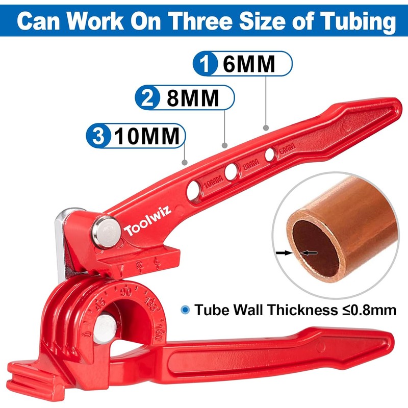 0-180° BENDING pliers: Toolwiz copper pipe bender allows you to bend soft pipes such as copper pipes, brass pipes, and aluminum pipes with a wall thickness of max ~0.8 mm. The scaling on the aluminum tube bender enables precise bends of up to 180° degrees