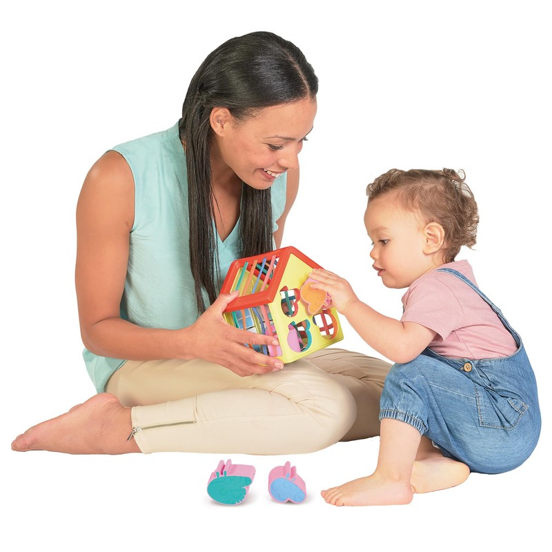 - COLOR & SHAPE SORTING GAMES FOR BABY The colored dad, mum, george, and Peppa Pig figures can be inserted through the wall slots to sort the shapes - the coarse, textured blocks are easy for little hands to grasp and stack into a neat tower.