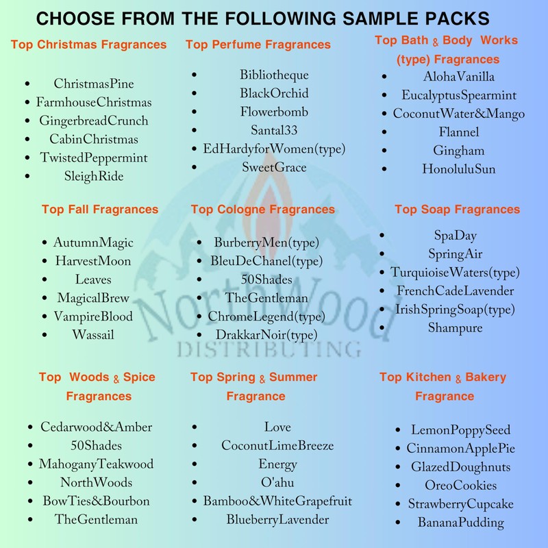 - Choose from the following sample packs: Top Christmas Fragrances, Top Fall Fragrances, Top Woods & Spice Fragrances (masculine scents), Top Perfume Fragrances, Top Cologne Fragrances, Top Spring & Summer Fragrances, Top B&BW Fragrances Top Soap Fragrances, Top Kitchen & Bakery Fragrances.