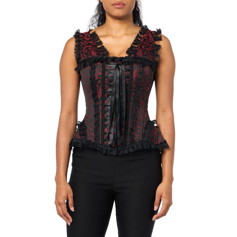 Top Drawer Red/Black Swirl Brocade & Lace Steel Boned Corset w/Cap Sleeves (6X)