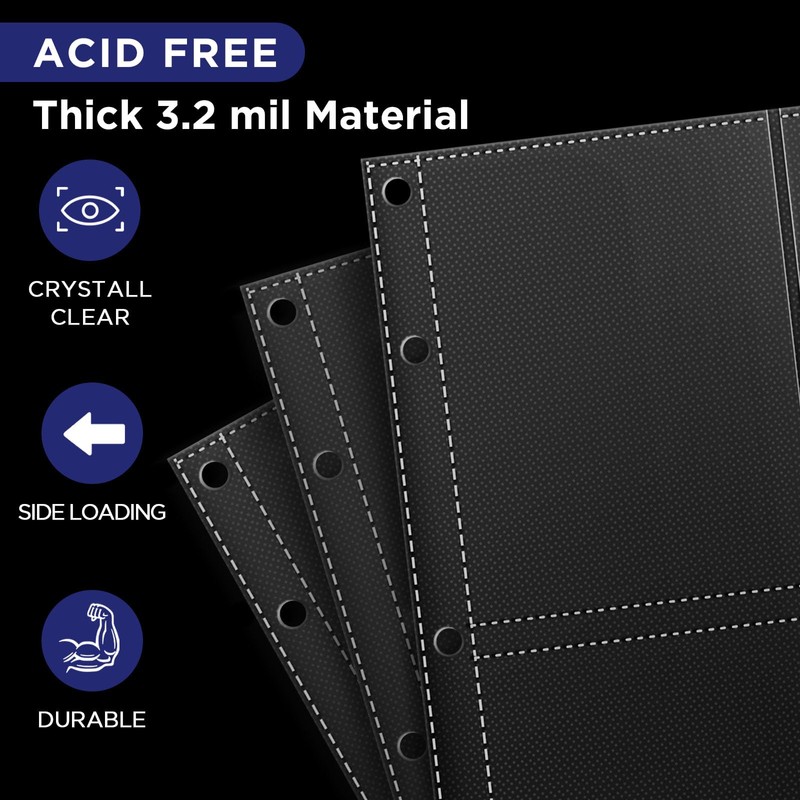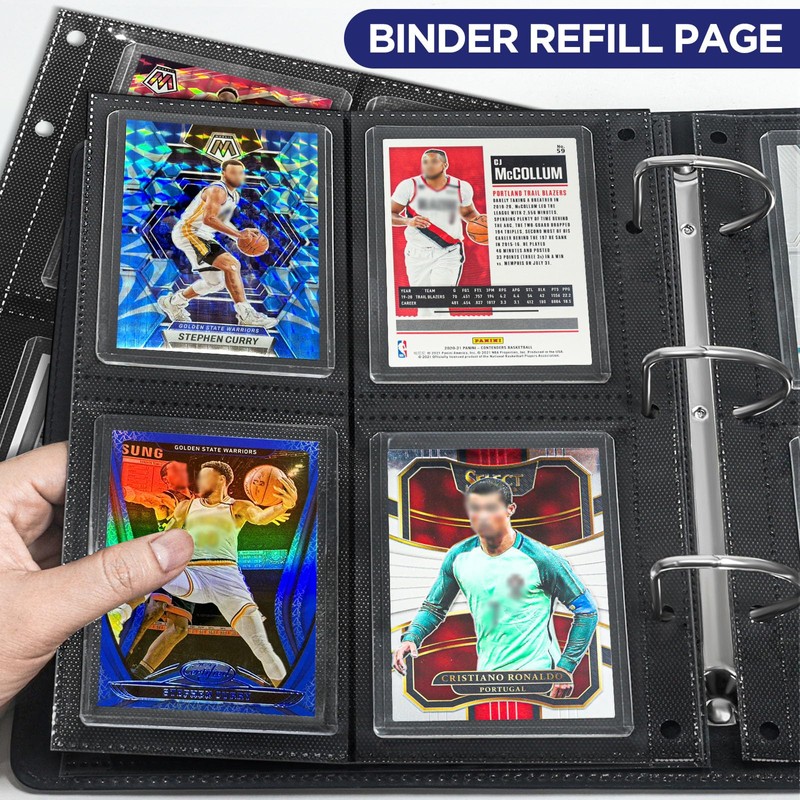 Organize, Protect, and Display Your Card Collection in Style! ________________________________________ Why Choose These Binder Sleeves? Showcase with Confidence: Display your toploader-protected cards without fear of dents, creases, or dust. Turn any binder into a professional-grade portfolio! Versatile Use: Perfect for sports cards (baseball, football, basketball), TCGs, mini photos and more Space-Saving Design: Slim profile maximizes storage while keeping collections easily accessible. ________________________________________ Specifications: Sleeve Dimensions: 7.48" x 9.25" Pocket Dimensions: 3.25" x 4.25" (fits 3" x 4" toploaders). Hole Distance: 2.75" and 4.25" (standard 3-ring binder compatible). Included: 50 pages (200 pockets total). ________________________________________ Perfect For: Trading gaming card enthusiasts Sports card collectors (baseball, football, basketball) Mini Polaroid photo albums ________________________________________ Pro Tip: Pair with a sturdy 3-ring binder for a sleek, portable storage solution. Keep your entire collection organized, protected, and ready to impress!