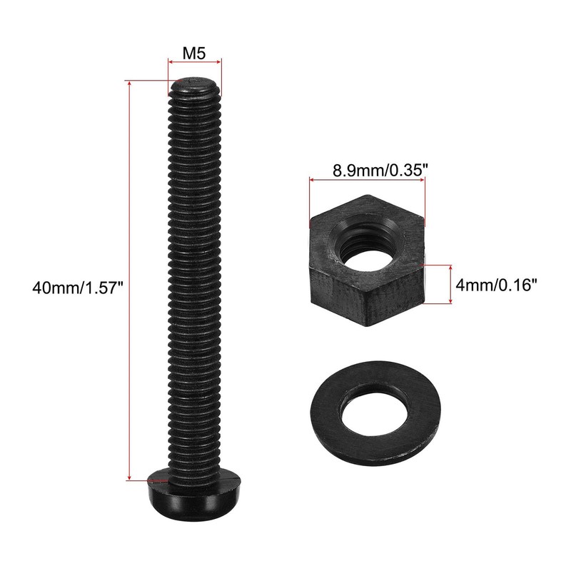 - 【Size & Package】40mm x 43mm/1.57" x 1.69"(Total Height x Screw Length); Fully Threaded; Hex Nut Size: 8.9mm x 4mm/0.35" x 0.16"(Hex Width x Height); Thread Pitch: 0.8mm. Package Including: 20 Set Metric M5x40mm Black Nylon Phillips Round Head Screws Hex Nut Flat Washer Assortment Kit