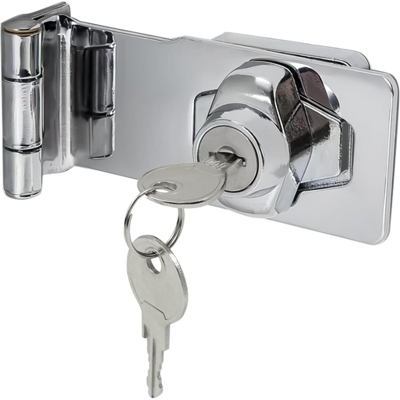 The built-in twist knob and keyed lock ensure extra security, preventing unauthorized access while allowing convenient locking and unlocking. With its right-angle design, this padlock hasp is ideal for corner installations in homes, offices, toolboxes, sheds, storage lockers, and fences.