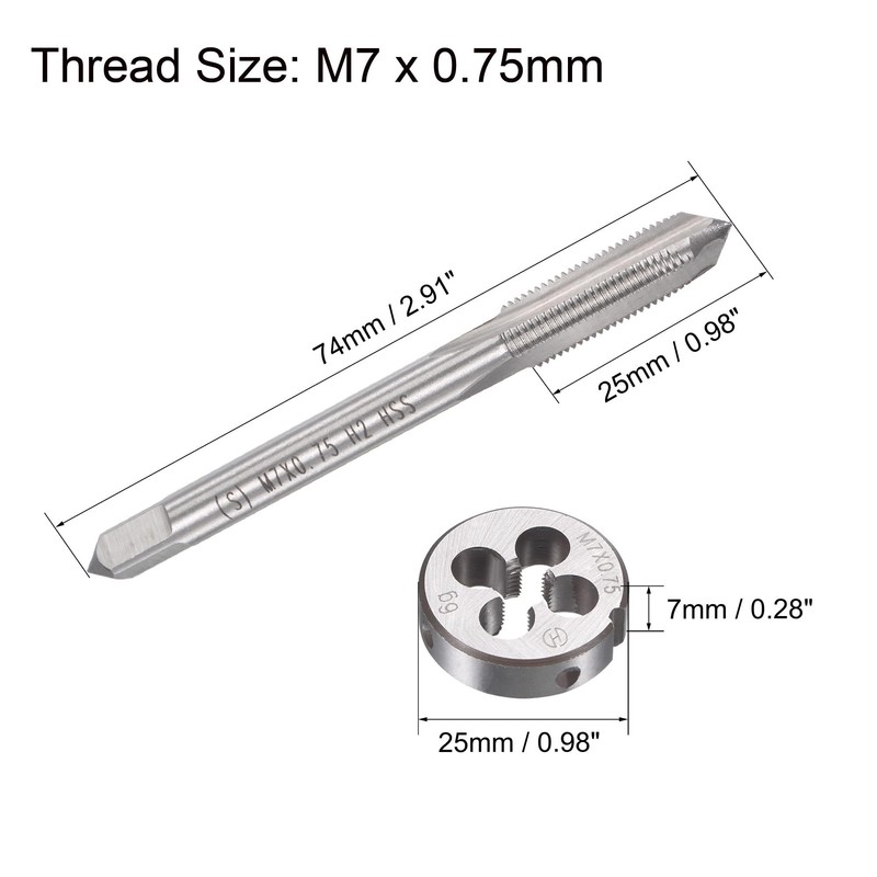 - [Size & Package] Right hand tapping direction; Package includes 1 x Thread Tap and Die Set. Tap Size: thread length: 25mm / 0.98"; overall length: 74mm / 2.91"; square shank: 4.5mm / 0.18"; Die Size: outside diameter (OD): 25mm / 0.98"; thickness: 7mm / 0.28".