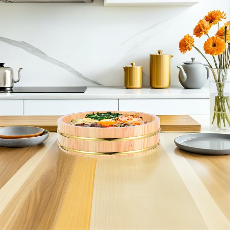 Sawara sushi rice container, ideal for home and use, this container helps you achieve the sushi rice texture. Wooden Fruit Bucket The wooden sushi rice mixing container with golden rim is an essential tool for sushi preparation. Japanese Sushi Rice Mixing Container In addition, it can be used storage container for the kitchen and adds a touch of cooking space to your kitchen. Sushi Oke Sawara for sushi restaurant. This traditional Japanese hangiri is used for mixing and cooling sushi rice and provides even seasoning and moisture absorption