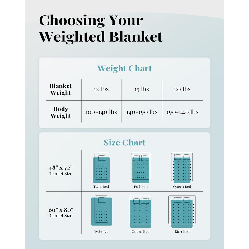 • Ideal Size: Studies suggest choose a weighted blanket around 10% of the user's body weight, plus / minus 1lbs, i.e. 12lbs Sherpa weighted blanket is for people of 110 - 140lbs. Choose a lighter blanket for first uses and it takes around 7 to 14 days to fully enjoy the benefits of the blanket.