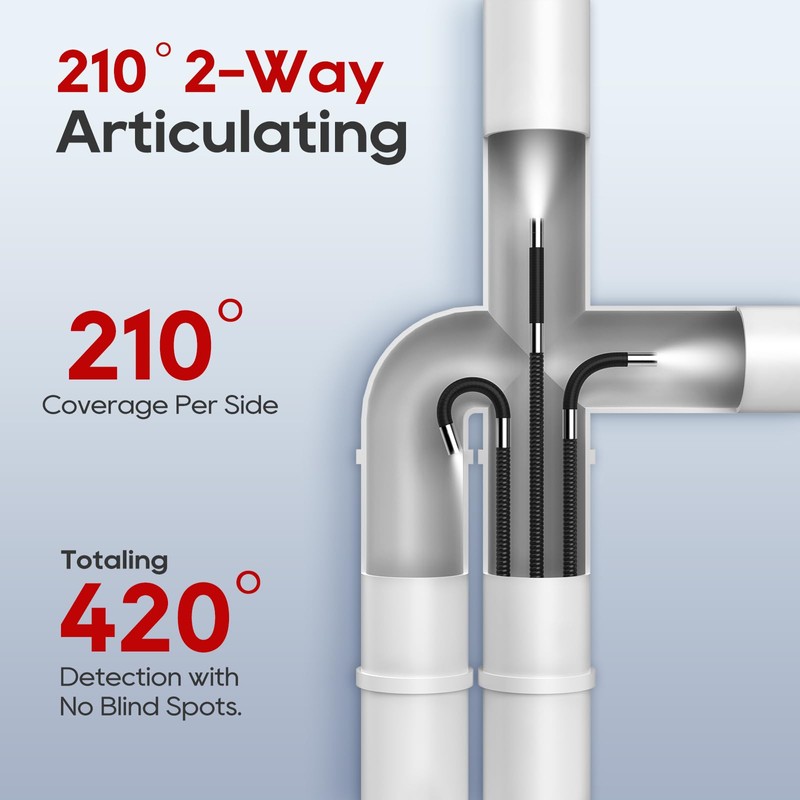 - Two-Way Articulating: 0.24-inch probe can reach into tighter spaces with ease. The snake camera offers 210° coverage per side, totaling 420° detection with no blind spots. Built to last with 10,000+ tested articulation cycles and a precision 2cm-10cm focusing range for detailed inspections
