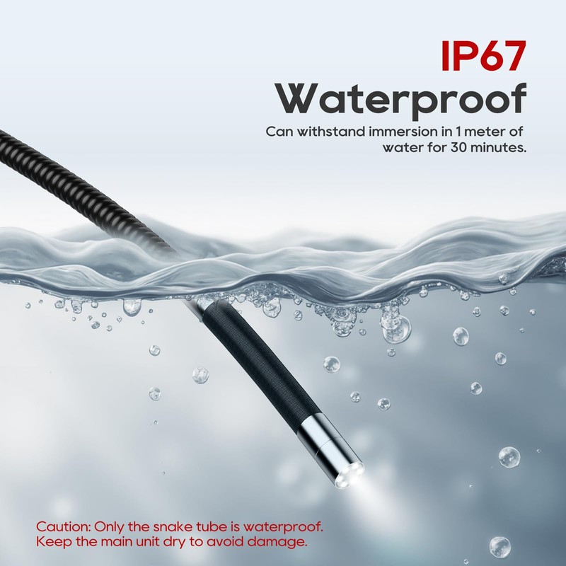 - IP67 Waterproof & Overheat Protection: The camera probe and cable are IP67-rated for dust/water resistance. It operates within a working temperature range of -10℃ to 50℃ and features an auto alarm and shutdown when the temperature exceeds 70℃