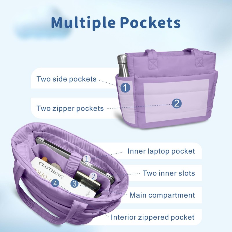 TOPDesign Puffer Tote Bag for Women, Lightweight Puffy Handbag with Compartments & Cosmetic Bag, Quilted Shoulder Bags for Work, Travel, Gym, Gifting (M Light Purple)