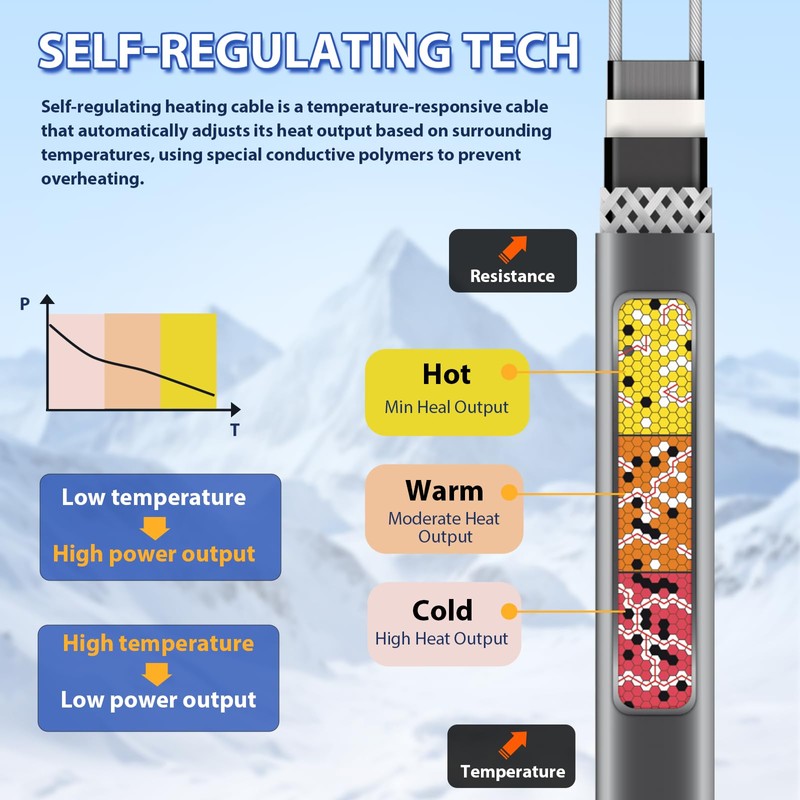 - [Self-regulating heating Tech] The pipe freeze protection heat cable can adjust its power output based on the ambient temperature smartly and never overheat or Burn. Installed with Straight-traced, Spiraled, or Overlapped.