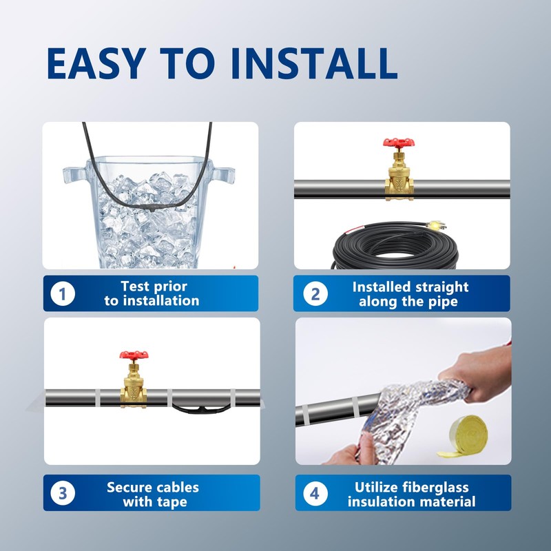 - 【Easy to install】Pre-assembled to use out of the box. Keep the cable straight-traced on the pipe and valve, affix with a good electrical tape and insulation. Never spiral. Never crossing. Never overlap itself.